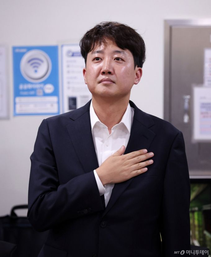 [서울=뉴시스] 김명년 기자 = 이준석 개혁신당 의원이 23일 오후 서울 여의도 국회 의원회관에서 열린 대선 평가 세미나에서 국민의례를 하고 있다. 2025.06.23. kmn@newsis.com /사진=김명년 |