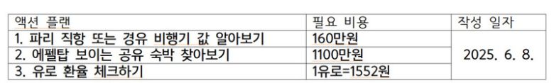 그렇다면 어떻게 목표를 정하면 좋을까요? 지금부터 이룰 수밖에 없는 나만의 목표 세우는 방법을 소개하겠습니다. 바로 목표에 시각화, 구체화, 수치화를 담는 것입니다. 예를 들어 ‘여행 가기’ 대신 ‘프랑스 파리 에펠탑이 보이는 공유 숙박에서 한 달 살기’라고 바꿔볼까요? 글만 읽었는데 머릿속에서 에펠탑과 샹젤리제 거리를 걷고 있는 모습이 떠올랐을 겁니다. 이를 동사형 목표라고 불러요. 이 방법대로 목표를 세운 다음 여기에 맞는 액션플랜을 만듭니다. ‘이렇게까지 해야 하나?’ 의구심이 들 수 있어요. 많은 사람이 목표는 정했는데 희망 사항으로 남는 이유가 구체적인 행동이 빠졌기 때문입니다. 매번 이루지 못한 채 흐지부지 사라졌다면 이번 기회에 새로운 방법으로 시도해 보세요. 목표 하나에 3가지 계획과 필요한 비용을 적습니다. 이루고 싶은 욕심이 커서 너무 많이 적으면 시작하기 전부터 지칠 수 있으니 주의하세요.