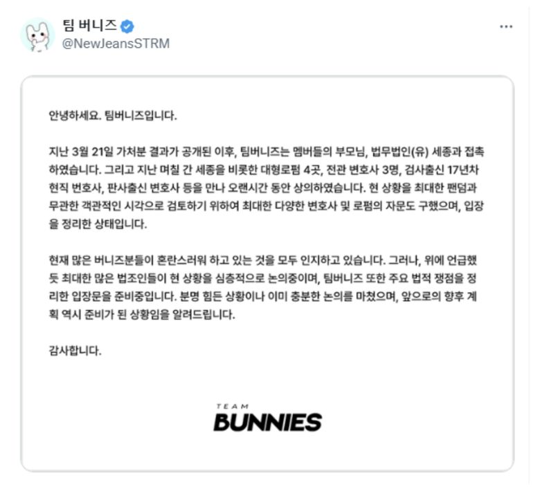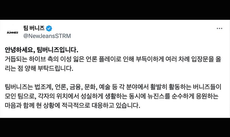 하지만 팀버니즈의 행보는 뉴진스 공식 팬덤인 '버니즈' 사이에서도 논란의 대상이다. 버니즈 일부 팬덤은 하이브에 "팀버니즈는 팬덤 전체의 의견이 아니다"며 해명하기도 했다.