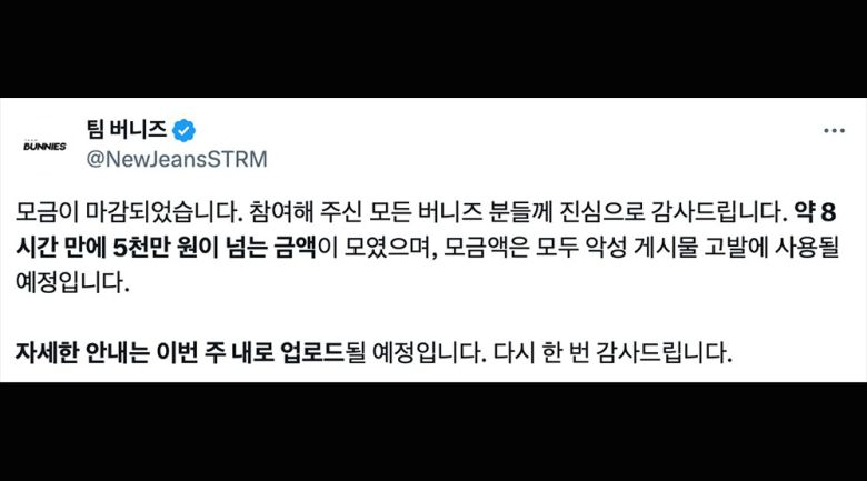 팀버니즈는 지난해 10월 21일, 뉴진스 악플 고발 명목으로 기부금을 모금했다. 그들은 기부 계좌를 SNS에 공개했고, 단 8시간 만에 5,122만 원을 모았다.