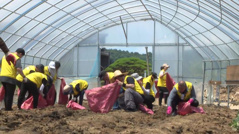 자원봉사자 100여 명이 오전 내내 오물을 치우고 하우스 보수를 도왔습니다.