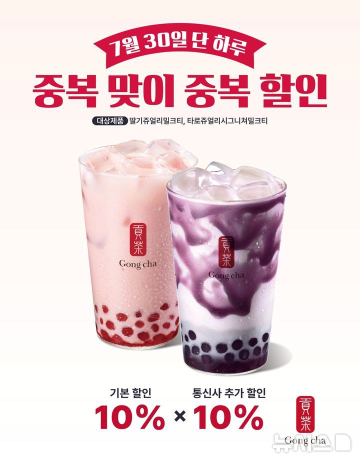 또 중복을 맞아 오는 30일 하루 동안 공차의 인기 음료 2종을 10% 할인된 가격에 제공한다. SKT 및 KT 멤버십 회원에게는 추가 10% 할인 혜택이 주어진다.