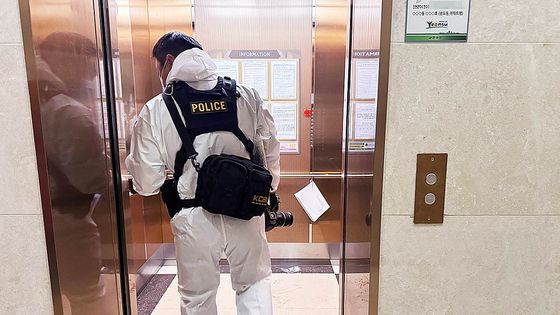 사제총기 살인사건이 발생한 인천 연수구 한 아파트 단지에 수사관이 엘리베이터를 타고 들어가는 모습. 뉴스1