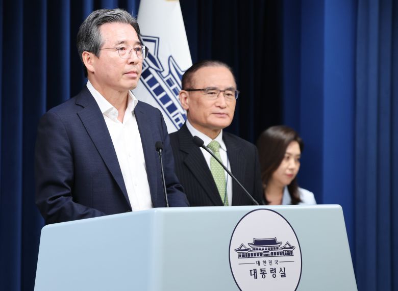 김용범 정책실장과 위성락 국가안보실장이 25일 서울 용산구 대통령실 청사에서 비서실장 주재 통상대책회의 관련 브리핑을 하고 있다./뉴스1