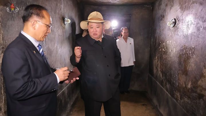 [서울=뉴시스] 김정은 국무위원장이 지난 24일 당·정부, 무력기관의 지도간부들과 함께 '반제계급교양의 거점'인 신천계급교양관을 돌아봤다고 조선중앙TV가 26일 보도했다. 김 위원장은 신천계급교양관의 전시실들과 사백어머니묘, 백둘어린이묘, 군당방공호, 화약창고 등 여러 곳을 둘러봤다. (사진= 조선중앙통신 캡쳐) 2025.07.26. photo@newsis.com *재판매 및 DB 금지