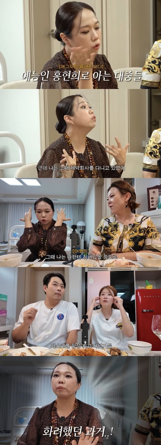김승혜는 “그때 언니가 연예인처럼 마스크를 항상 끼고 다녔다. 눈이 예뻐서 사람들이 (홍현희에게) 번호를 물어봤다. 그랬다는데 우리는 그 말을 안 믿었다”라고 첨언했다.