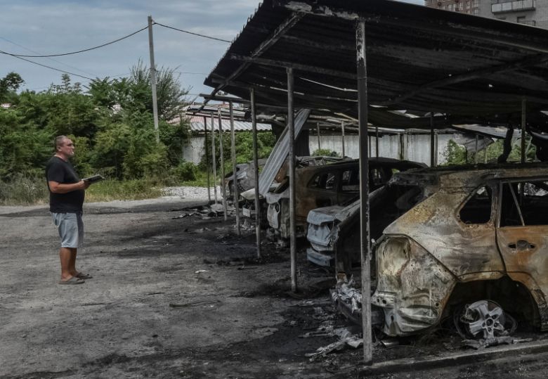 우크라이나 드니프로 주민이 26일 러시아의 드론 공격으로 불타버린 차량 옆에 서있다. 로이터 연합뉴스