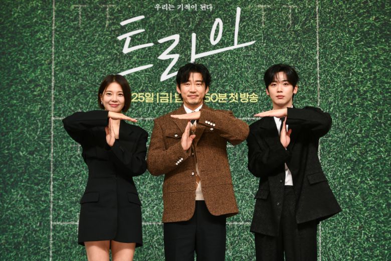 배우 임세미(왼쪽부터), 윤계상, 김요한이 25일 서울 목동 SBS에서 열린 새 금토드라마 ‘트라이: 우리는 기적이 된다’의 제작발표회에 참석해 포즈를 취하고 있다. SBS 제공