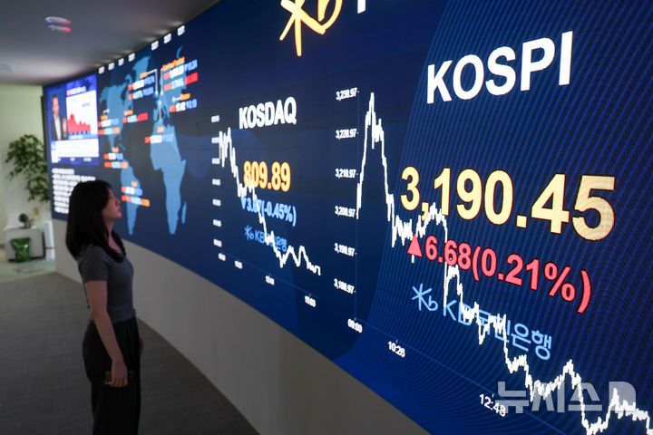 [서울=뉴시스] 김명년 기자 = 사진은 지난 24일 오후 서울 여의도 KB국민은행 스마트딜링룸에서 딜러들이 업무를 보고 있는 모습. 2025.07.24. kmn@newsis.com |