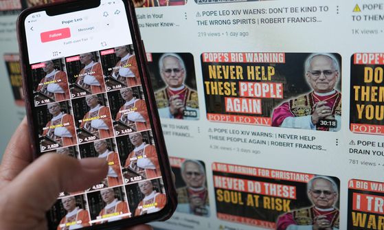 지난 6월 2일 교황 레오 14세 관련 AI 생성 딥페이크 콘텐트가 스마트폰과 컴퓨터 화면에 표시돼 있다. 유튜브·틱톡 등 플랫폼이 이를 단속하기 위해 조처했지만, 조회수가 급증했다. AFP=연합뉴스 |