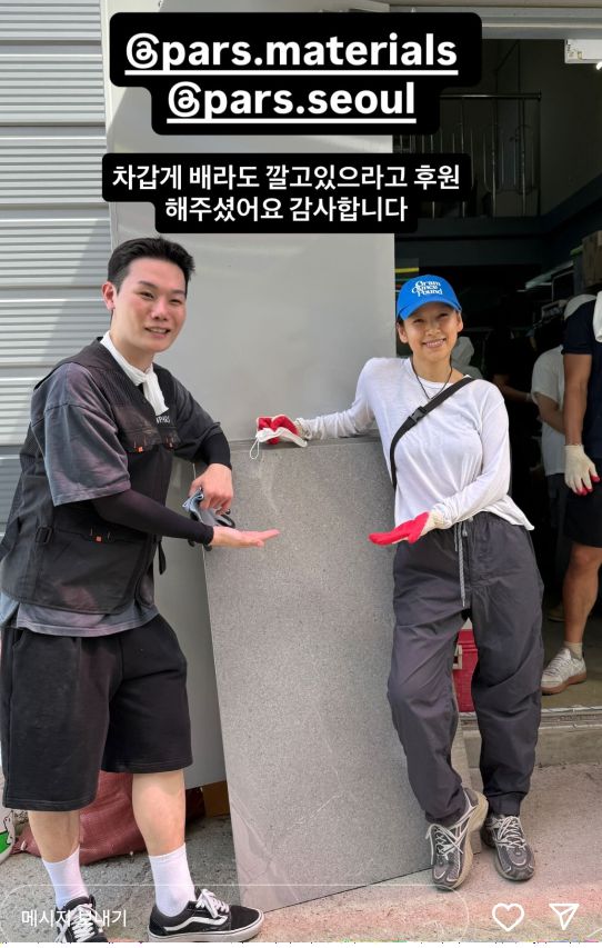 팔을 걷어붙이고 직접 현장에 나선 이효리는 바닥재 후원 현장을 소개하며 “차갑게 배라도 깔고 있으라고 후원해주셨어요. 감사합니다”라는 글을 남겼다.