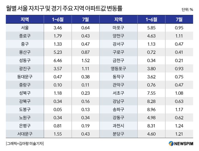 서울 아파트값은 서울시의 토지거래허가구역 해제 '이벤트'가 발생한 올해 1월 이후 6월 27일 이전까지 6개월간 3.46% 올랐다. 7월 한달간 아파트값 상승률은 0.64%다. 자치구별로 살펴보면 이 역시 빈익빈부익부가 고스란히 나타난다.