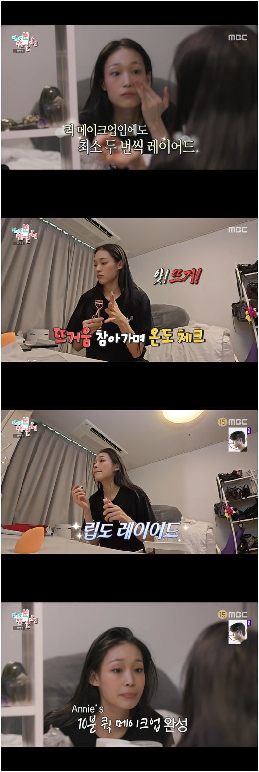 여성 멤버들이 함께하는 숙소에서 살고 있는 애니는 일어나 운동 후 10분 메이크업을 시작했다. 애니는 “저는 모 아니면 도여서 10분 안에 메이크업을 끝내지 못하면 안 한다”라면서 섀딩 3종류를 시원스럽게 스틱과 가루 형태로 칠한 후 블러셔를 두 가지로 끝낸 애니는 드라이어기로 뷰러를 데운 후 속눈썹을 올렸다. 엄청난 속도와 시원스러움에 모두가 감탄했다.