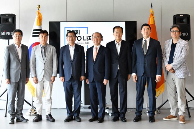 제9회 KWO 나지포럼 참석자들이 기념촬영을 하는 모습. 왼쪽부터 신석호 동아닷컴 대표이사 전무, 마영삼 전 주이스라엘대사, 백승주 전쟁기념사업회장, 윤강현 전 주이란대사, 안호영 전 주미국대사, 김용휘 융갤러리 회장. /사업회 제공