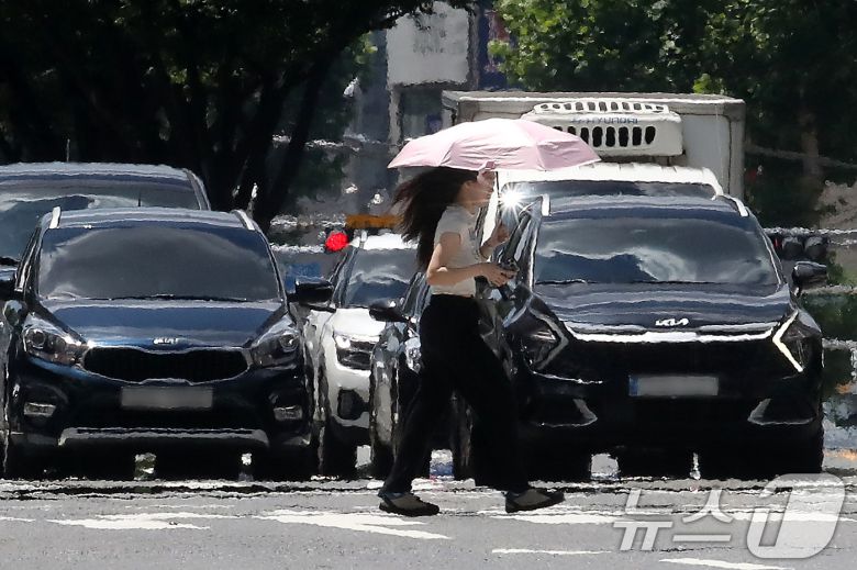 대구 중구 달구벌대로에서 양산을 쓴 시민이 아지랑이가 피어오르는 도로를 건너고 있다. 2025.7.25/뉴스1 ⓒ News1 공정식 기자