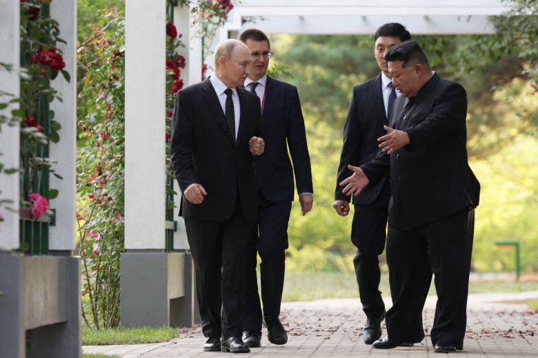 2024년 6월 19일 평양을 방문한 블라디미르 푸틴 러시아 대통령(왼쪽)이 김정은 북한 국무위원장과 함께 걷고 있다. 로이터연합뉴스
