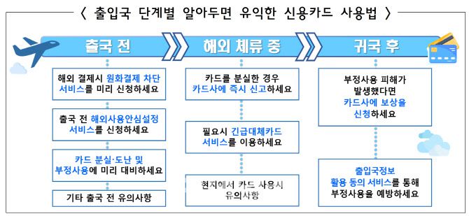 또 금감원은 해외체류 중 부정사용이 발생하지 않았더라도, 카드정보가 유출돼 귀국 후 문제가 생길 수 있다며, 귀국 직후 ‘해외 출입국 정보 활용 동의 서비스’나 카드사 앱의 ‘해외사용 일시정지’ 기능을 활용해 사후 관리도 병행해야 한다고 조언했다.
