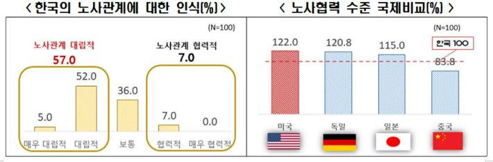 조사에 응답한 외투 기업들은 한국의 노사 협력 수준을 100으로 가정했을 때 미국은 122.0, 독일 120.8, 일본 115.0, 중국 83.8이라고 밝혀 중국을 제외한 3개국 모두 노사 협력 부문에서 한국보다 우위라고 평가했다.