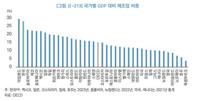 한국의 지디피 대비 제조업 비중은 2015년 30.2%에서 2019~2022년 28%대를 기록했다가 2023년엔 이보다 소폭 낮아졌다. 그런데도 전통 제조업 강국인 독일(19.7%·2024년 기준)이나 일본(20.7%)보다도 높은 비중의 제조업 중심의 산업 구조를 유지하는 것이다. 아일랜드는 다국적 기업들의 생산기지로, 제약 분야 등의 고부가가치 제품을 생산해 제조업 부가가치 비중이 높게 나타난 것으로 분석됐다. 한국은 반도체·디스플레이·이차전지 등 첨단 제조업뿐만 아니라, 자동차·조선·철강 등 전통 제조업 분야에서 국제적인 경쟁력을 확보하고 있다.