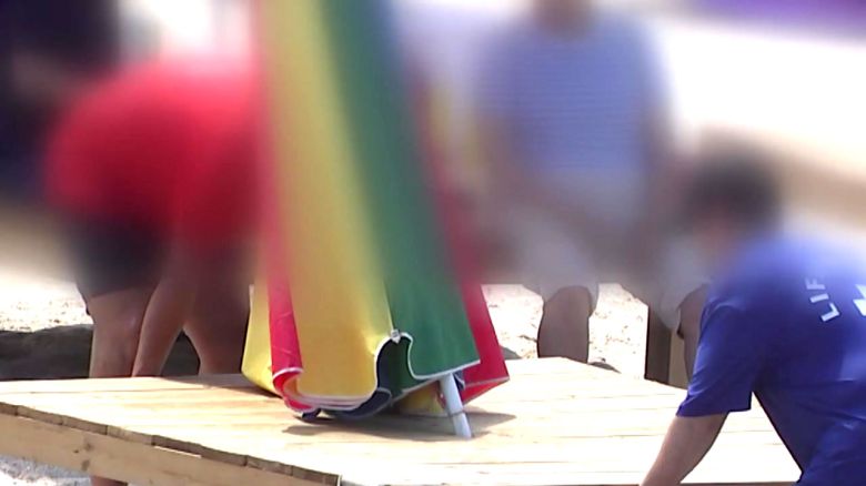 파라솔 설치하는 안전요원...인건비 줄이려고 안전은 뒷전?