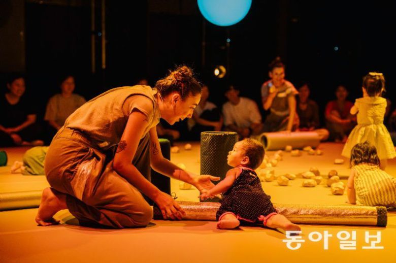 25일 서울 종로구 대학로예술극장 소극장. 푸른 조명이 비치는 무대 바닥에 아기 관객 15명이 엄마, 아빠와 함께 둘러앉았다. 막이 오르자 한 아기가 무대 중앙을 향해 온 힘을 다해, 그러나 아장아장 걸어갔다. 곳곳에 흩어진 황금빛 돌을 조막만 한 손으로 쥐기 위해서였다. 다른 아이들도 속속 부모 품을 벗어났다. 아기들은 두 팔과 다리를 사용해 무대를 마음껏 다니면서 ‘처음 만난’ 세상을 탐험했다. 어디선가 울음소리가 터져 나왔다. 아이는 울음을 쉽게 그치지 않았지만 따가운 시선을 보내는 사람은 아무도 없었다.