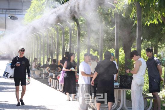 전국 대부분 지역에 폭염경보가 발효된 27일 서울 광진구 뚝섬유원지에서 시민들이 쿨링포그로 더위를 식히고 있다. 이날 기상청은 “전국에 폭염특보가 발효된 가운데 최고체감온도가 35도 내외로 올라 매우 무덥겠으니 온열질환에 각별한 주의가 필요하다”고 예보했다. (사진=이영훈 기자) |