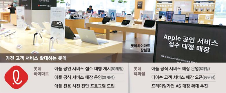 롯데하이마트가 국내 유통 업계 최초로 '애플 공인 서비스 접수 대행'을 전국 110개 점포로 확대한다. 고객 수요가 높은 가전의 서비스를 강화해 고객 접근성을 높이기 위해서다. 롯데백화점도 다이슨 서비스 매장을 개점하는 등 프리미엄 가전 사후서비스(AS) 역량 강화를 추진한다.