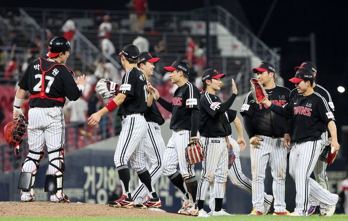 LG 선수들이 23일 광주-KIA 챔피언스필드에서 열린 2025 KBO리그 KIA전에서 연장 접전 끝에 6-5 승리를 거두고 하이파이브하고 있다. 사진 | 연합뉴스 |