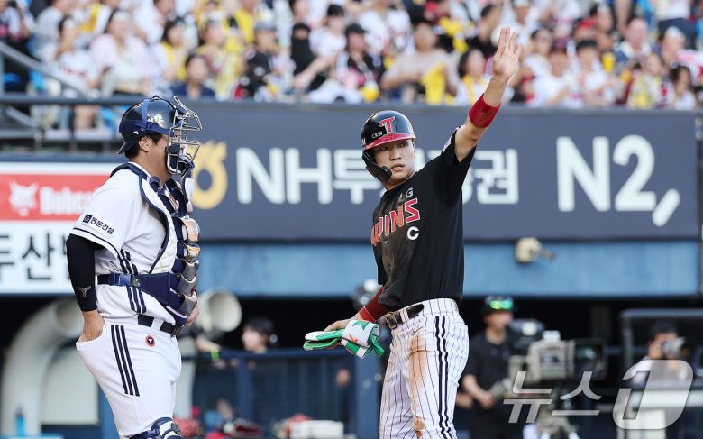 (서울=뉴스1) 박지혜 기자 = 27일 서울 송파구 잠실야구장에서 열린 프로야구 '2025 신한 SOL뱅크 KBO 리그' LG 트윈스와 두산 베어스의 경기, 3회초 무사 3루 LG 박해민이 신민재의 1타점 적시타때 득점에 성공하고 있다. 2025.7.27/뉴스1