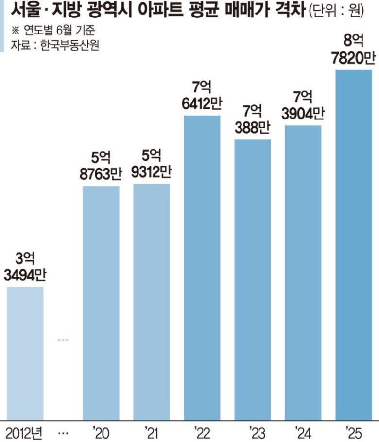 평균 매매가 격차도 갈수록 커지고 있다. 한국부동산원 평균 매매가 통계는 2012년부터 제공되고 있다. 지난 6월 기준 평균 매매가 격차는 8억7820만원으로 역대 최고다. 통계를 보면 2012년만해도 서울과 지방 광역시 매매가 격차는 3억원대 수준이었다. 2019년에 5억원대로 벌어졌고, 2021년에 7억원대, 올해 들어서는 8억원대로 커진 것이다.