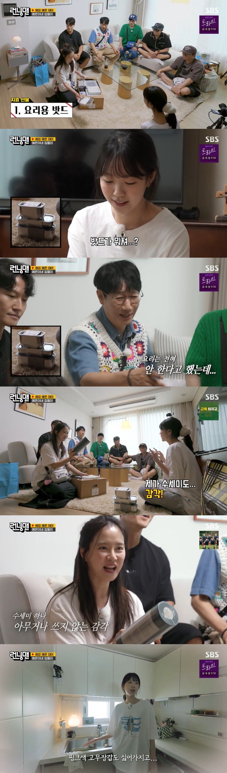 가장 먼저 선물을 공개한 송지효는 "주방용품이 얼마나 있는지 몰라서"라며 밧드를 꺼내 보였고, 평소 요리를 잘 하지 않는다는 지예은은 "밧드가 뭐죠?"라고 물어 웃음을 자아냈다.