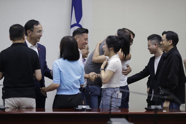 26일 대만 타이베이에서 제1야당 국민당 소속 의원들과 당 관계자들이 기자회견을 가진 뒤 환호하고 있다. 최근 대만 시민단체들은 반중 성향인 집권 민주진보당(민진당)의 지지 속에 친중 성향의 국민당 소속 의원 24명에 대해 파면 투표를 추진했으나 모두 부결됐다. 라이칭더 대만 총통의 리더십에 적잖은 타격을 줄 것이란 전망이 나온다. 타이베이=AP 뉴시스 |
