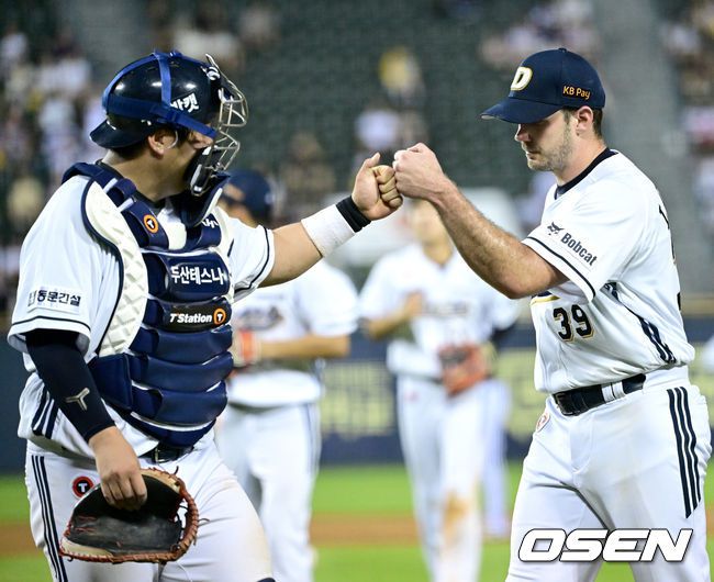 [OSEN=잠실, 최규한 기자] 27일 서울 잠실야구장에서 ‘2025 신한 SOL Bank KBO리그’ 두산 베어스와 LG 트윈스의 경기가 열렸다. 홈팀 두산은 잭 로그, 방문팀 LG는 최채흥을 선발로 내세웠다. 6회초 LG 공격을 무실점으로 막아낸 두산 선발 잭 로그가 더그아웃으로 향하며 포수 김기연과 인사를 나누고 있다. 2025.07.27 / dreamer@osen.co.kr 이 기사의 카테고리는 언론사의 분류를 따릅니다.0공유하기