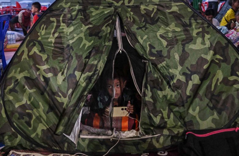 텐트 안은 안전할까…태국 피란민 수용소 26일(현지시간) 태국과 캄보디아가 국경 지대에서 무력 충돌을 이어가는 가운데 태국 북동부 시사켓에 마련된 수용소에서 피란민들이 쉬고 있다. AFP연합뉴스 |
