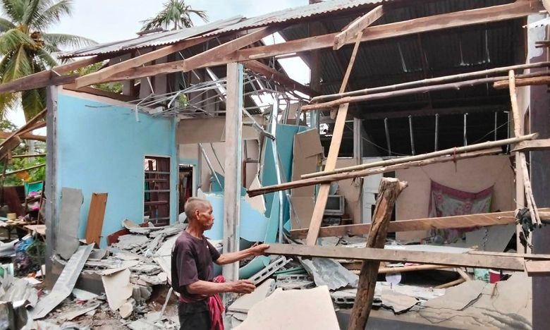 처참한 현장 25일(현지시간) 캄보디아와 국경을 맞대고 있는 태국 우본라차타니주에서 전날 있었던 양국 간 교전으로 파괴된 주택을 한 남성이 살펴보고 있다. 우본라차타니=신화연합뉴스
