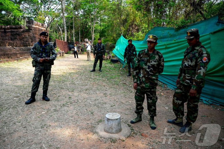 캄보디아 군인(우측)과 태국 군인이 2025년 3월 26일 국경 분쟁지역인 프라삿 타 무엔 톰(프라삿 탄 무엔 톰)에서 경계 근무를 서고 있다. ⓒ AFP=뉴스1 ⓒ News1 최종일 선임기자