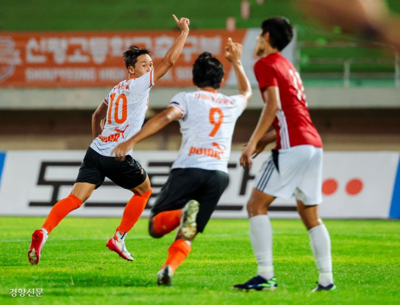 “해냈다” 결정적 한 방 충남 신평고 유동경(10번)이 27일 충북 제천종합운동장에서 열린 제58회 대통령금배 전국고교축구대회 서울 보인고와의 결승전에서 1-0으로 앞선 후반 추가골을 넣은 뒤 세리머니를 펼치고 있다. 제천 | 권도현 기자 |