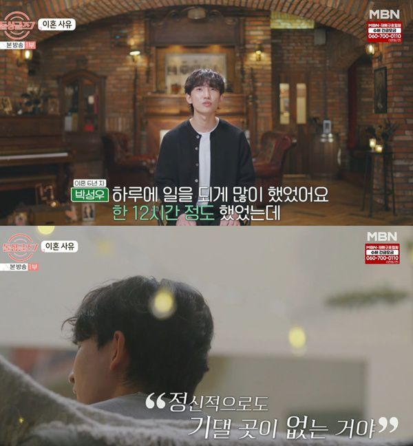 박성우는 "퇴근하고 집에 걸어서 들어가는데 들어가는 길이 너무 힘들었다. 골목길에 들어가서 울기도 했다. 기댈 곳이 없고 의지할 곳이 없네 생각했다. 너무 고독하고 외로웠었던 것 같다. 그렇게 합의이혼으로 끝이 났다"고 고백했다.