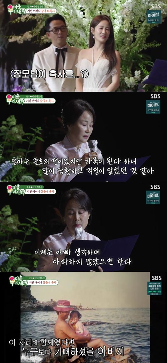 마이크를 잡은 김지민 어머니는 "어느 날 네가 준호와 결혼을 전제로 만나는데 엄마가 반대하면 안 만날 거야, 라고 말했을 때 엄마는 준호의 팬이었지만 가족이 된다니 많이 당황하고 걱정이 앞섰던 것 같아"라고 운을 뗐다.