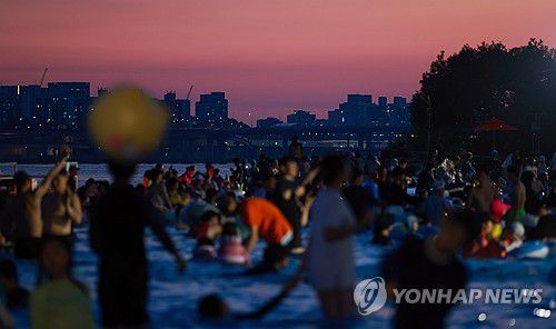 더운 저녁에도 물놀이(서울=연합뉴스) 신현우 기자 = 서울 한낮 기온이 38도까지 오르는 등 무더위가 이어진 27일 '2025 한강페스티벌_여름' 프로그램 한강시네마퐁당이 열린 서울 마포구 난지한강공원 물놀이장에서 시민들이 물놀이를 하고 있다. 2025.7.27 nowwego@yna.co.kr