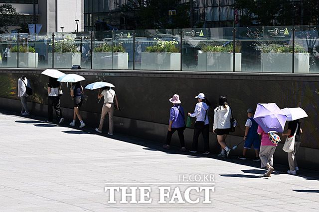 28일 기상청에 따르면 이날 낮 최고기온은 32~37도를 오르내리겠다. 전국 대부분 지역에 폭염 특보가 내려진 27일 오전 서울 종로구 광화문광장을 찾은 시민들이 그늘로 이동하고 있다. /남용희 기자