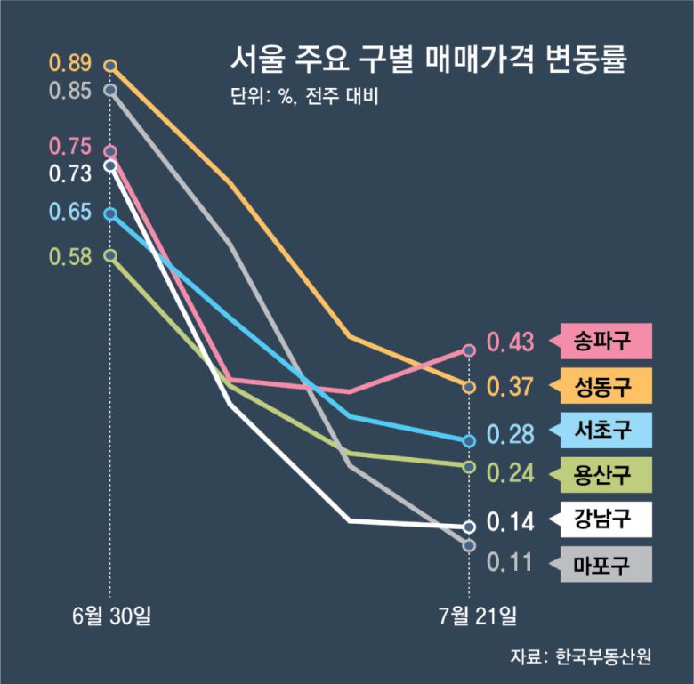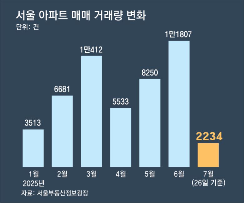 정부의 6·27 대출 규제 시행 한 달 만에 서울 아파트 거래가 급감하고, 가격 상승세도 한풀 꺾였다. 다만 고액의 현금을 융통할 수 있는 ‘현금 부자’들이 움직이면서 강남권 등 고가 아파트는 여전히 높은 가격에 거래되고 있다. 이에 따라 7월 서울 아파트 평균 매매가는 사상 처음으로 14억 원을 넘어섰다. 금융당국은 언제든 가계대출의 불씨가 살아날 가능성을 경계하며 대출 규제 우회로로 꼽히는 사업자 대출 실태 점검에 나섰다.