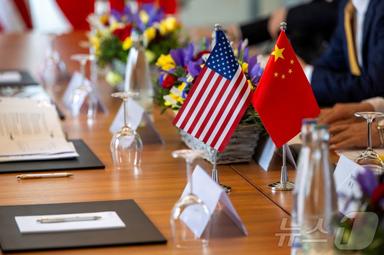 미국 성조기와 중국의 오성홍기가 5월 10일 스위스 제네바에서 열린 미국과 중국의 양자 고위급 무역 회담 중 협상 테이블에 놓여 있는 모습. 양국은 이날 관세 문제와 비관세 장벽 등을 논의했다. 2025.5.10 ⓒ 로이터=뉴스1 ⓒ News1 강민경 기자 |