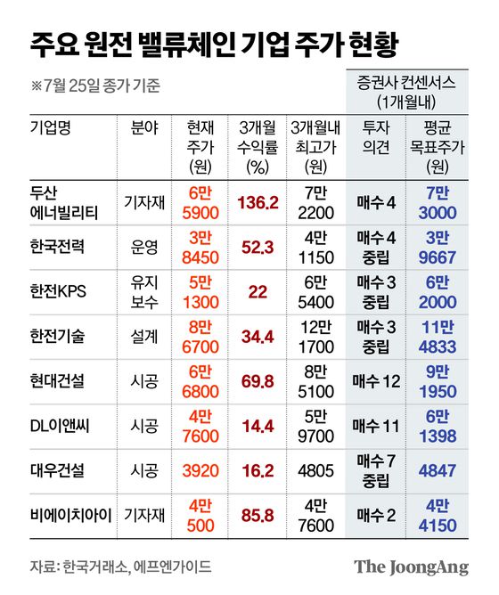 기대감이 커지고 경쟁력이 확인되면서 원전과 관련된 거의 모든 종목이 이미 크게 오른 상태다. 이제 투자자가 따져볼 것은 K원전 밸류체인 속에서도 상승 여력이 더 큰 곳은 어디냐는 것이다.