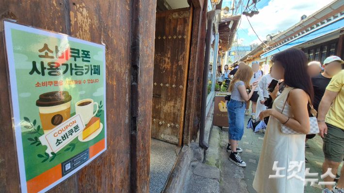 27일 오후 서울 종로구 익선동 골목이 사람들로 붐비는 가운데 한 카페 입구에 민생회복 소비쿠폰 사용이 가능하다는 홍보물이 붙어 있다. 송선교 기자