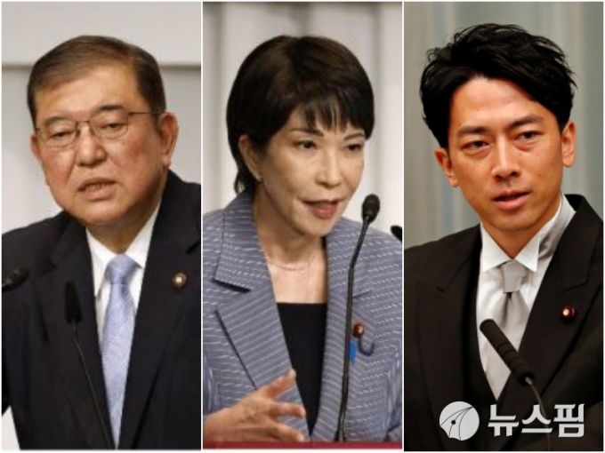 왼쪽부터 이시바 시게루 총리, 다카이치 사나에 전 경제안보담당상, 고이즈미 신지로 농림수산상. [사진=로이터 뉴스핌] |