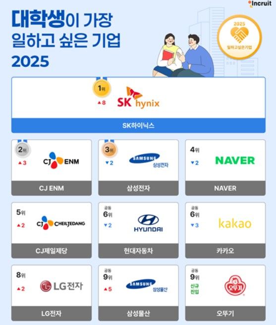 HR 테크기업 인크루트는 구직 중인 대학생 1176명을 대상으로 국내 증시(코스피·코스닥) 시가총액 상위 170개사(지주사·금융사·공기업 제외)를 대상으로 조사한 '2025 대학생이 일하고 싶은 기업'에서 SK하이닉스(7.1%)가 1위를 차지했다고 28일 밝혔다.