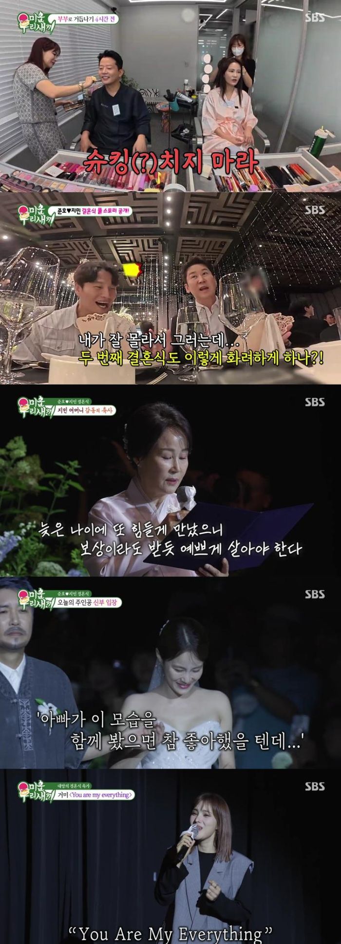 결혼 전 날 싸우지 않았냐는 질문에 김지민은 “우리는 오히려 거사 전에는 싸우질 않는다”라며 든든한 애정을 과시했다. 한편 김준호는 “우리 엊그제 잠옷 입고 리허설해 보지 않았냐. 음악만 틀어도 눈물이 나오더라”라고 이야기했고, 김지민은 “아빠 못 오시는 것도 그렇고”라며 돌아가신 아버지의 빈자리를 실감하며 울컥했다.