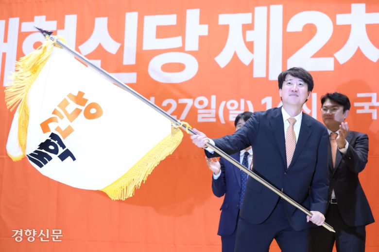 개혁신당 제2차 전당대회가 열린 지난 27일 국회의원회관 대회의실에서 단독 출마로 당선된 이준석 당 대표가 당기를 흔들고 있다. 한수빈 기자