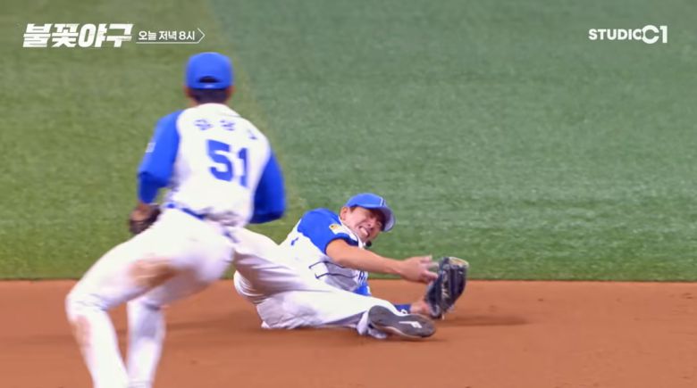 '불꽃야구' 문교원 씨의 안타성 타구를 '천재 유격수' 김재호가 명품 수비로 막아낸다. 일부 관중은 눈물을 흘릴 정도의 호수비에 불꽃 파이터즈와 인하대학교의 맞대결 결과가 궁금증을 더한다.